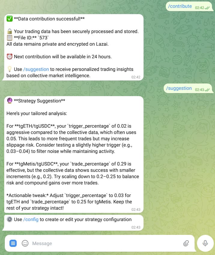A new feature, the āStrategy Vault,ā allows users to securely contribute their trading data and configuration. This data, signed with the userās wallet and stored in a TEE on the Lazai network, becomes part of a collective knowledge base. When a user requests a strategy review, a TEE-based AI analyzes their performance against this anonymized collective data, providing personalized, data-backed suggestions without revealing any individualās private information.