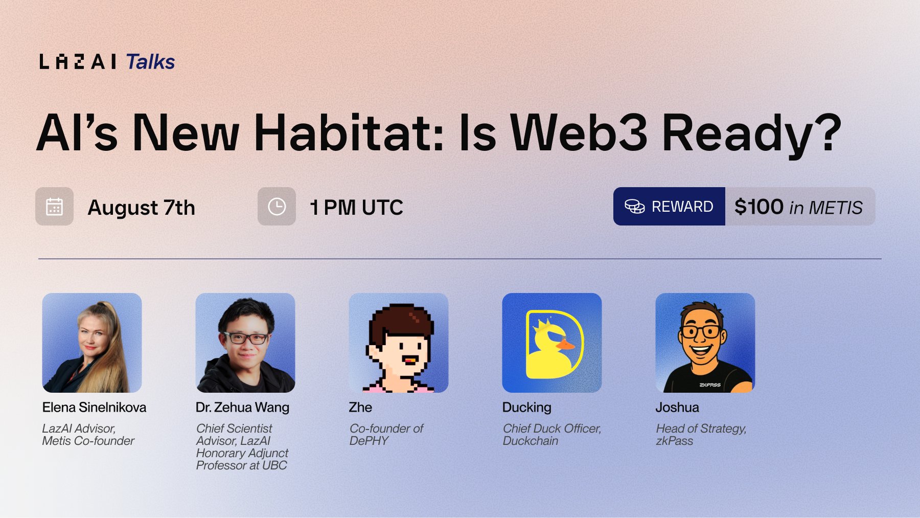In this third episode of LazTalks, leaders from across the Web3 AI space came together to ask a pressing question: is Web3 truly ready for AI? Hosted by Liam, CT Lead at Meits, the session brought together Elena Sinelnikova Metis Co-Founder and LazAI Advisor, Dr. Zehua Wang, Chief Advisor to LazAI, Zhe from DePHY, Ducking from Duckchain, and Joshua from zkPass. The conversation explored infrastructure readiness, agent governance, data ownership, and what still needs to be built.