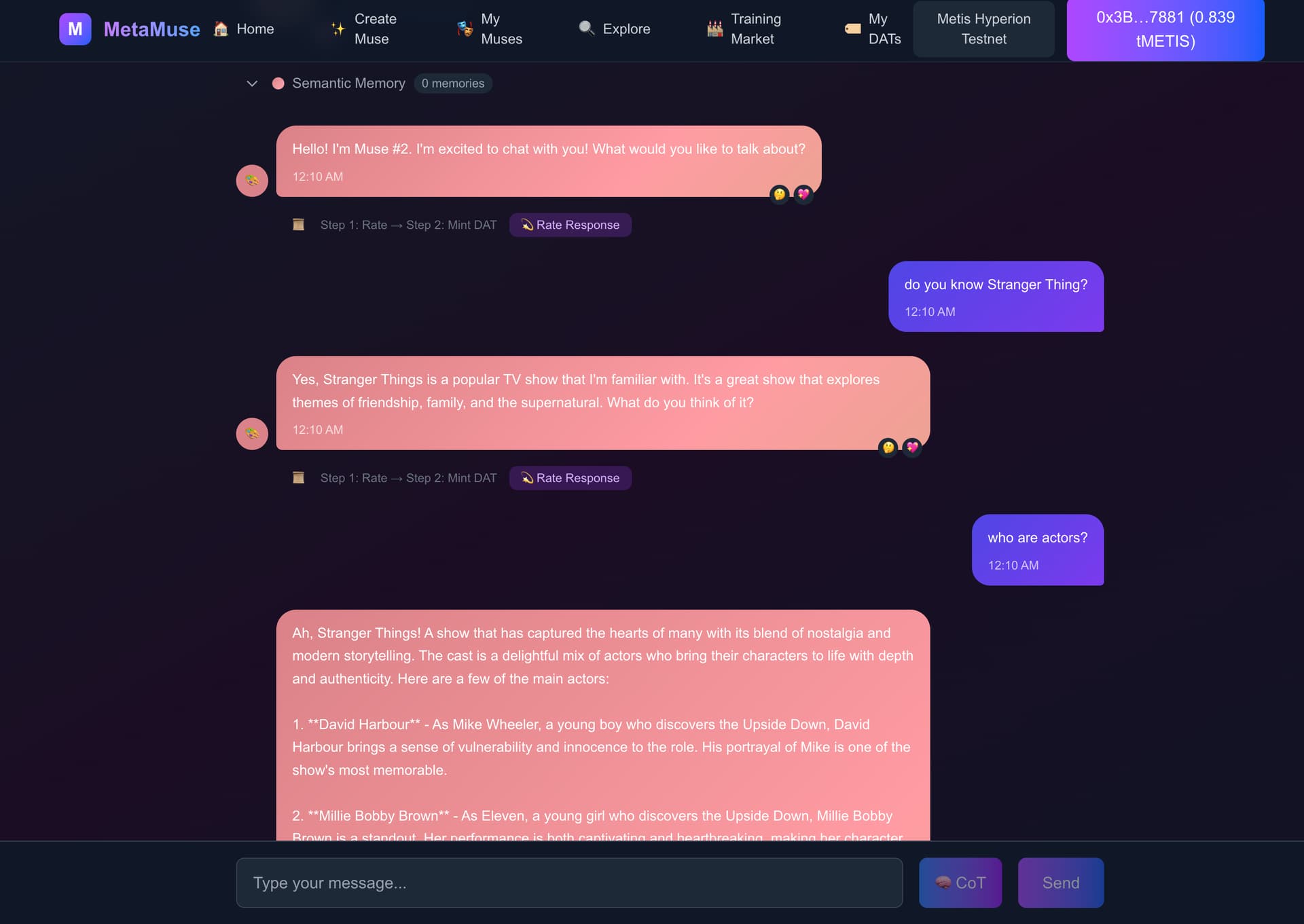 Welcome to MetaMuse — a network for verifiable and upgradeable AI muses living natively on Metis Hyperion. MetaMuse moves beyond simple companionship, offering a source of creative inspiration that combines verifiable on-chain inference, true digital ownership, and a gas-less interactive experience.