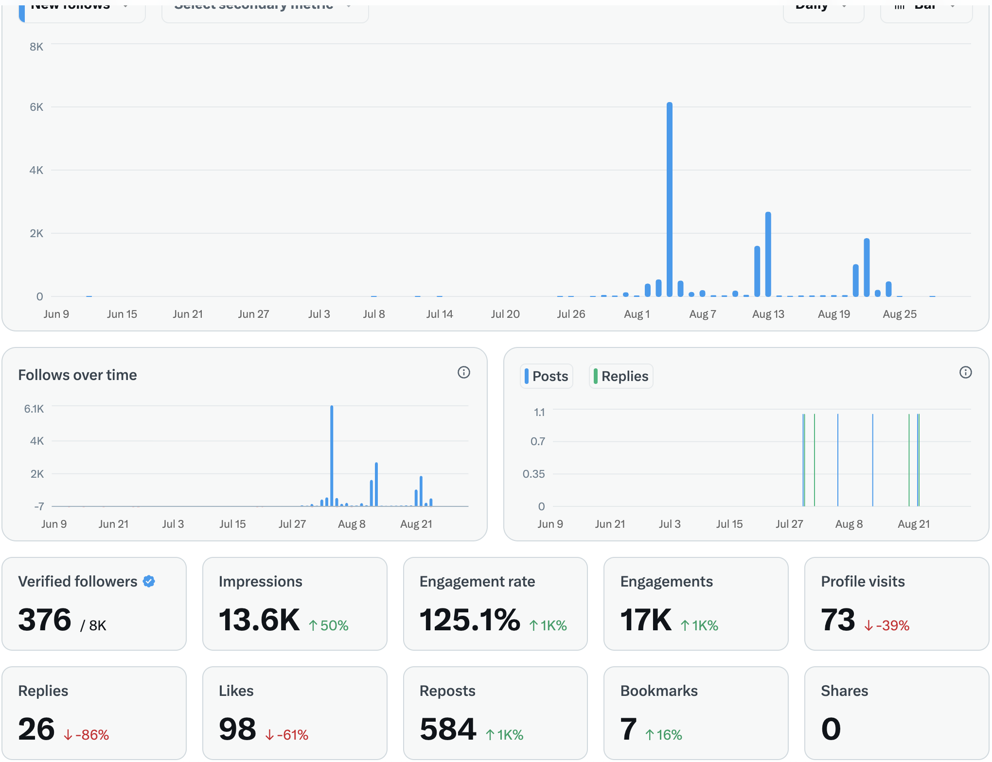 - 75% X (Twitter) account growth and quality (verified via TwitterAudit)
