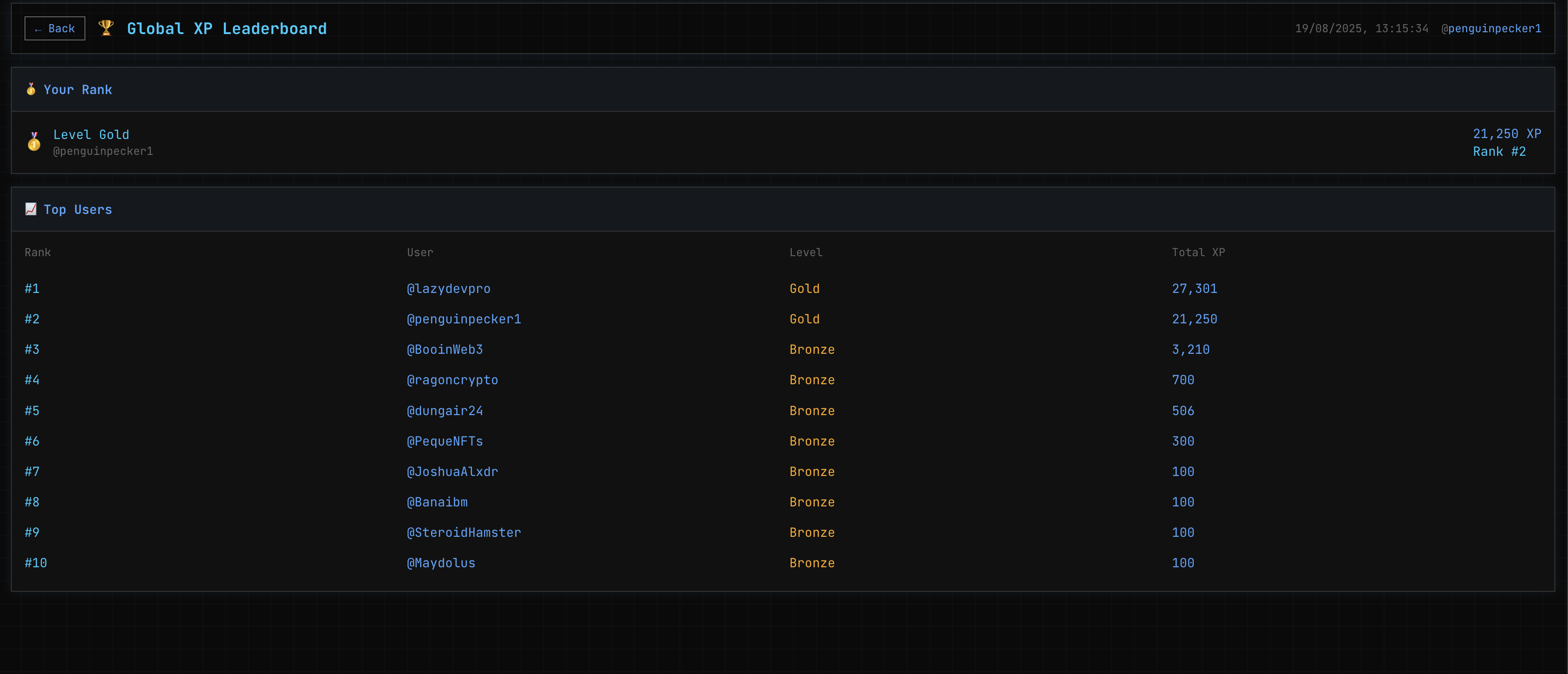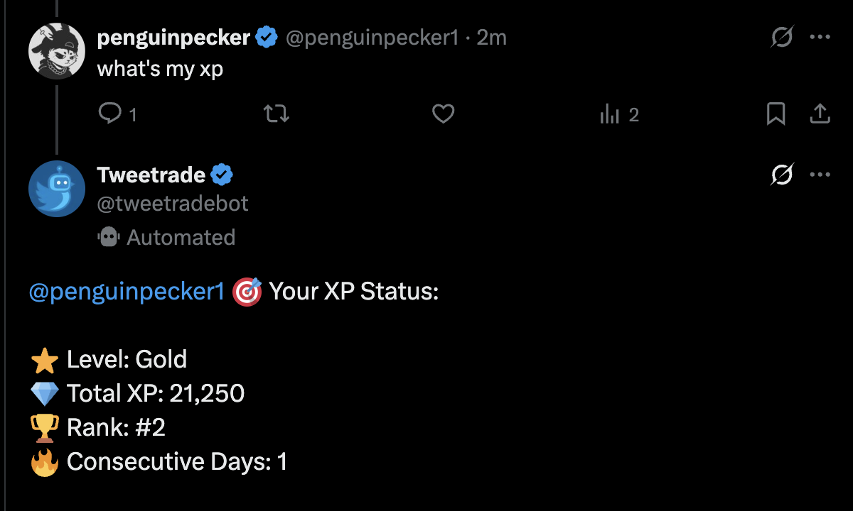 Gamified Quests: Competitive Leaderboard for Users to Compete with each other and Top the Leaderboard. Users can Track their Bot interaction XPs both on twitter and through Dashboard