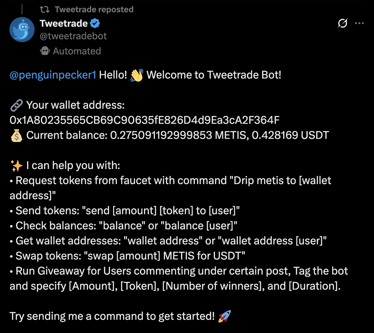 A wallet is automatically created during the first interaction with the bot on Twitter or by logging in through the dashboard using your Twitter account. This wallet remains linked to your Twitter profile.